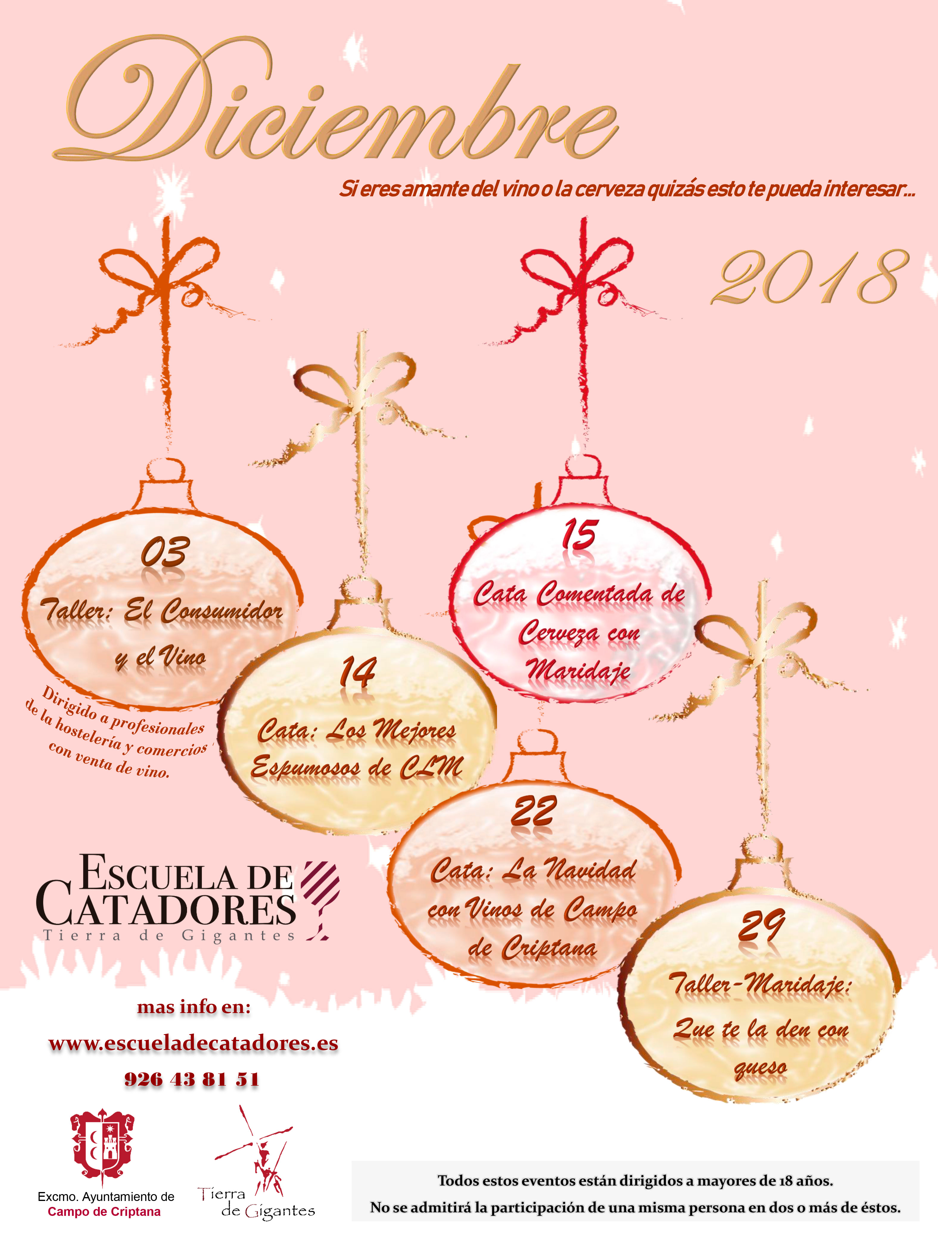 Durante el mes de diciembre se va a realizar en Escuela de Catadores diferentes catas y talleres relacionados con el vino o la cerveza. A continuación puedes ver la programación del mes: